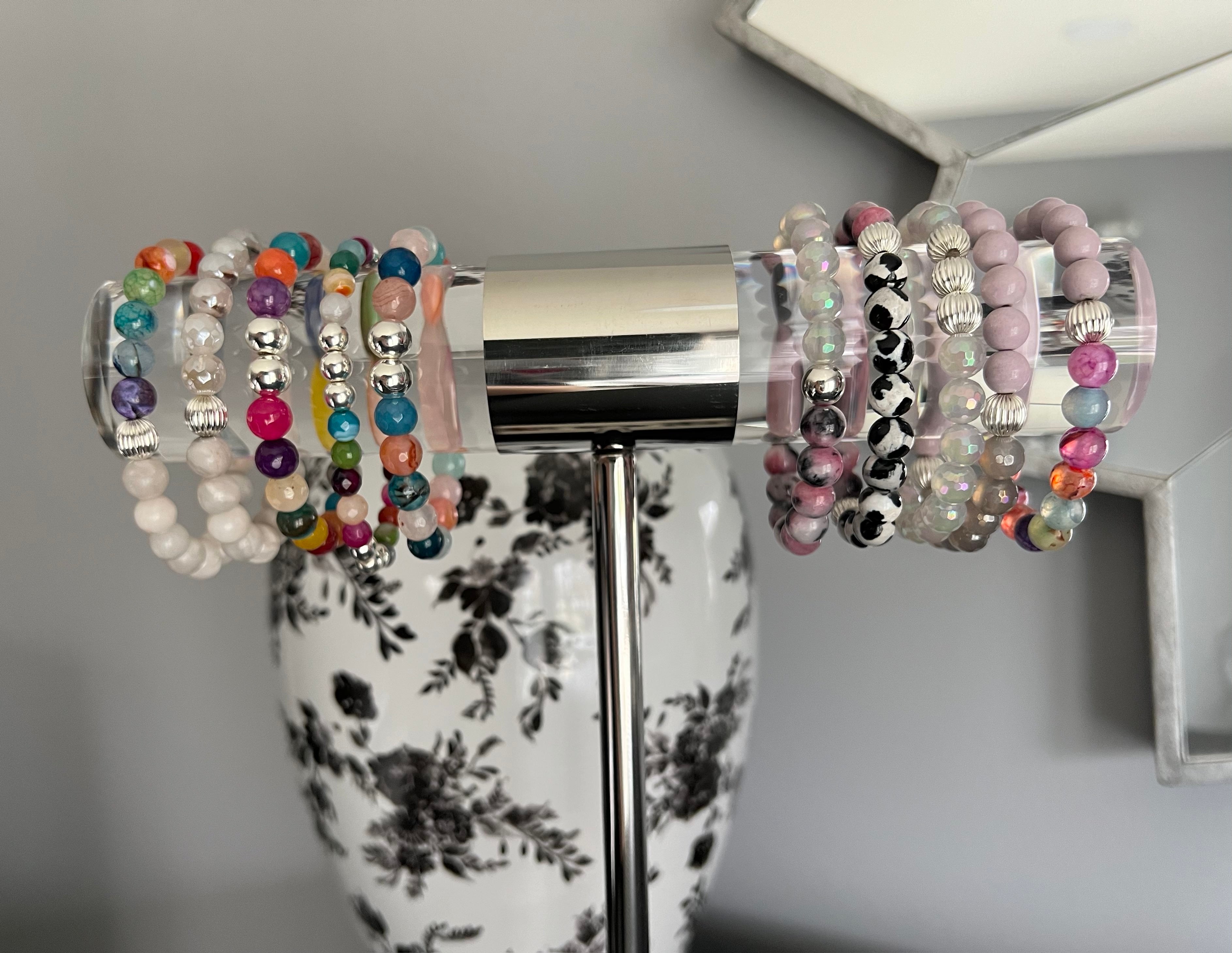 Each bracelet is handmade with natural gemstones in a variety of colors mixed with gold, silver, or rose gold accents. My designs, inspired by the beautiful, colorful world around us, are unique, whimsical, fashionable, and designed to be worn in stacks. All my bracelets can be dressed up, dressed down, or just worn with sweats around the house as I always do!
